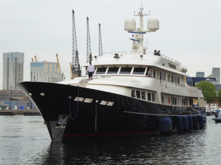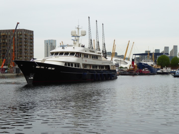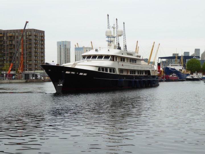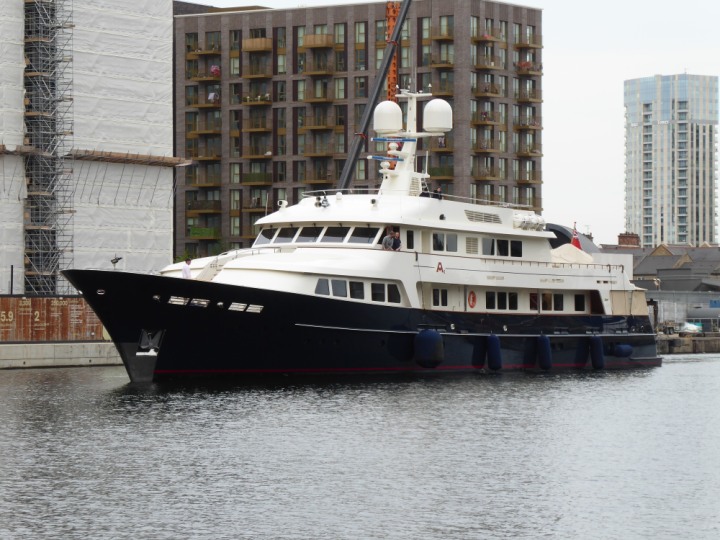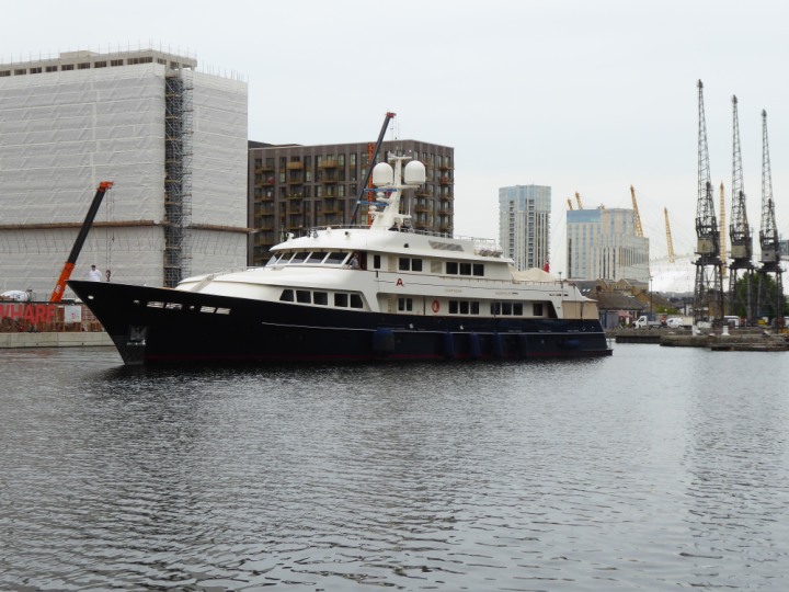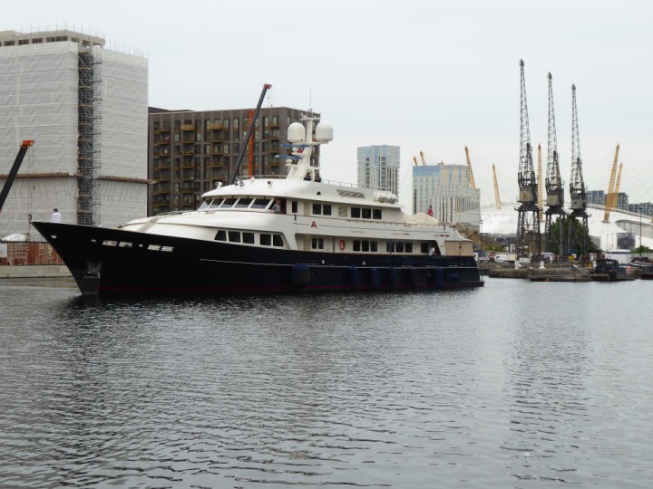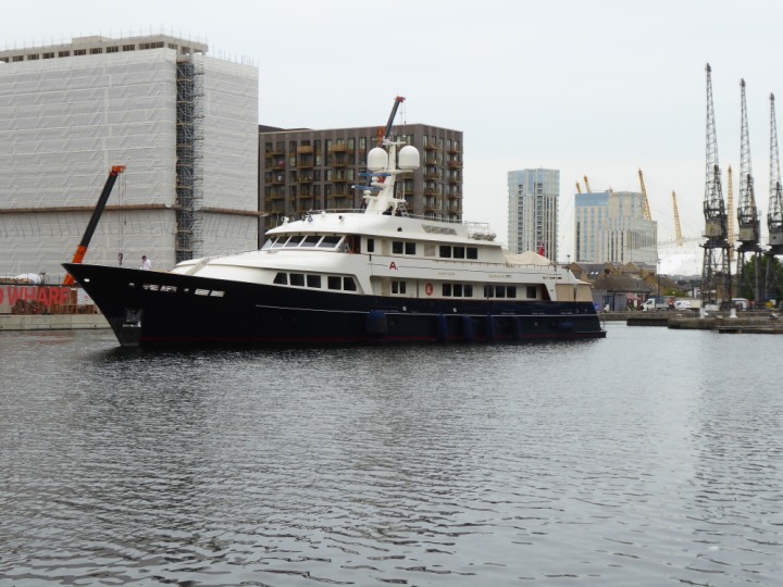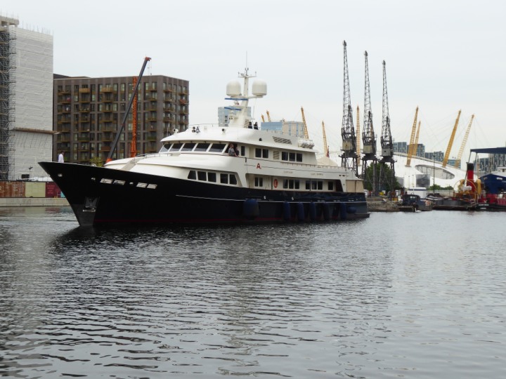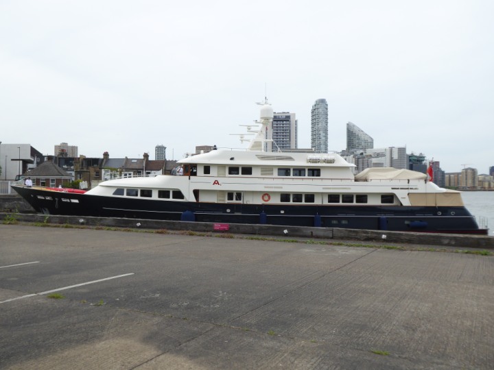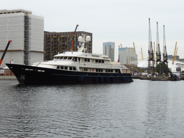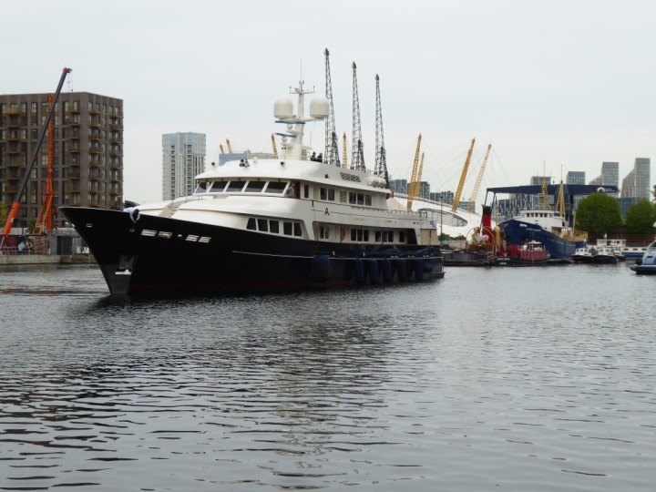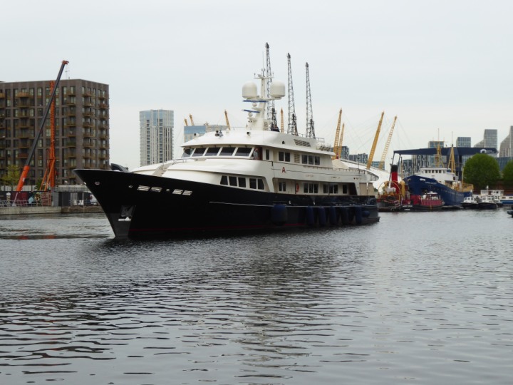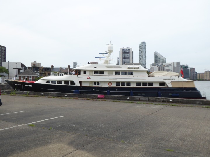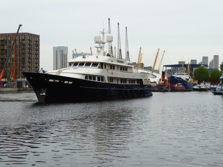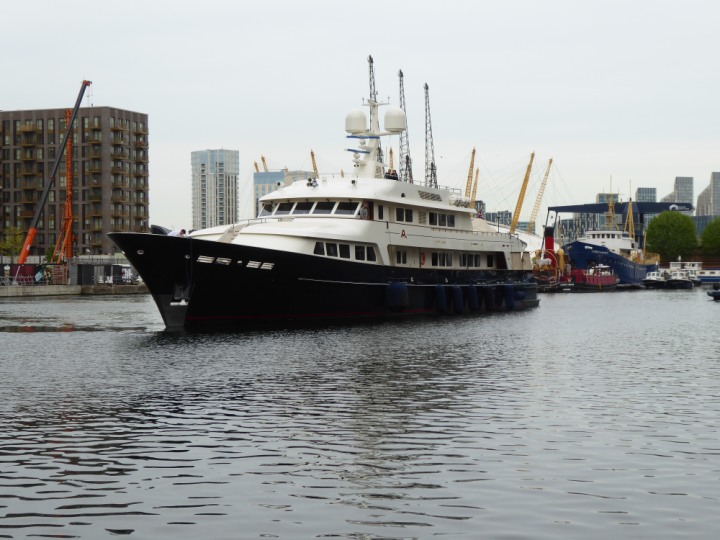 A2 *Click a Photo Above   once Big, click Right    Arrow in corner >   to start Slide Show * romagic .22 L:47.35x8.08m (155x26ft+) Friday 6th May 2022  16:44pm This  Super Yacht  was built in 1983 and is just under 50 mtrs  in length and 26ft wide, slightly  smaller than the newer yachts of today. Guests 12 in 6 staterooms and a crew of 9 in compact cabins,.. West India Dock