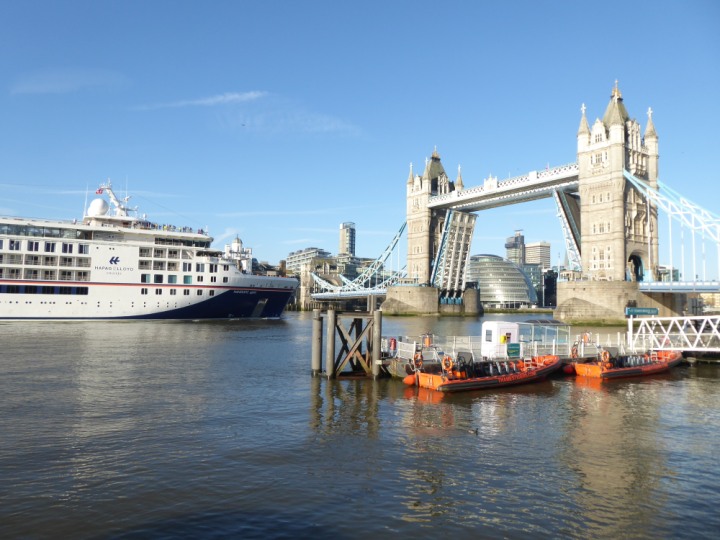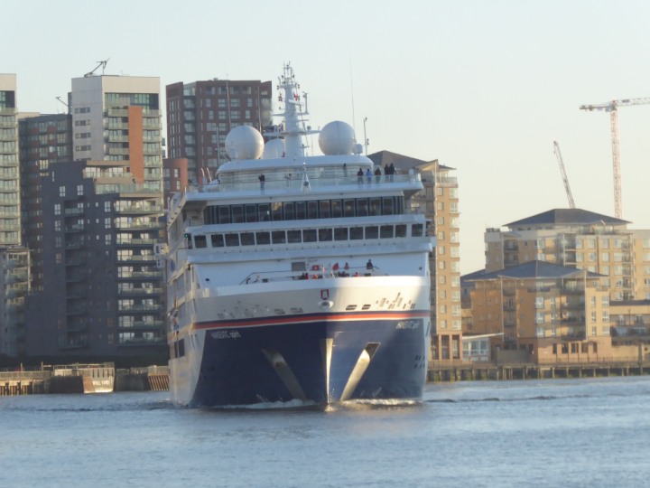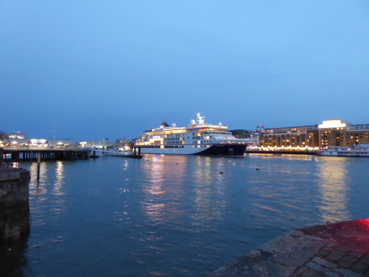 HANSEATIC SPIRIT romagic .22 *Click a Photo Above   once Big, click Right    Arrow in corner >   to start Slide Show * L:139. x 22.3m (455x76ft+) Saturday 9th April 2022 This is the 1st Cruise Ship to visit London this year Tower Bridge lift was 8am Lots of passengers were  on the top decks as it passed under the Bridge. Built 2021 just a year old at 455 feet long, it's able to stay in the the upper Pool of London, larger  ships  at Greenwich. The Ship is only staying till  tomorrow departing 8pm Departure 8.15pm * Arrival: 7.15am Light fading getting dark, night time shots are very tricky, too many sparkly  lights to focus on.
