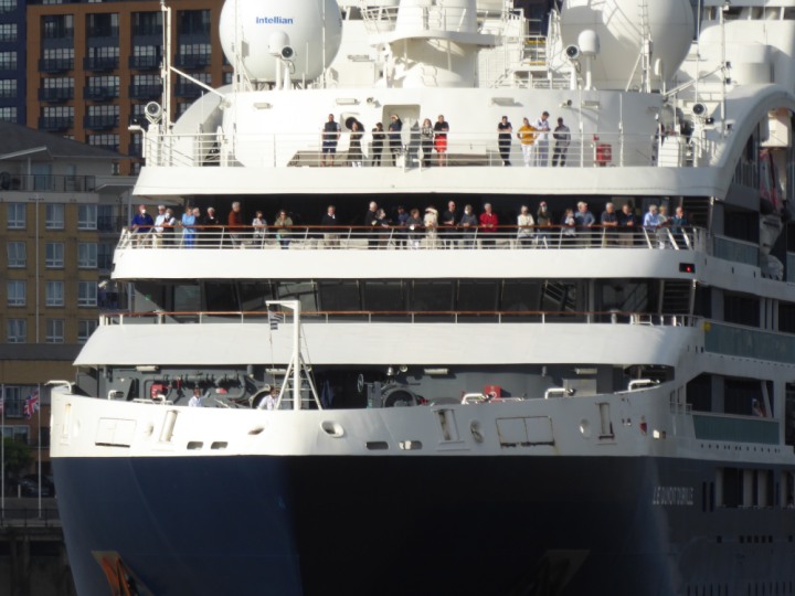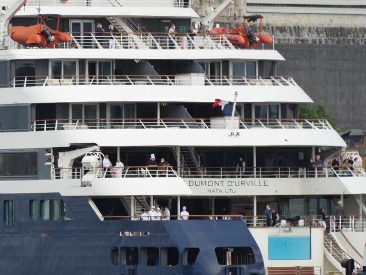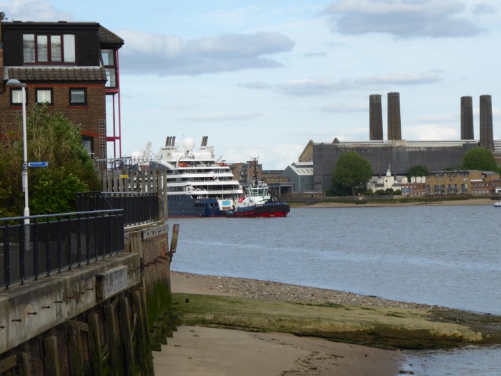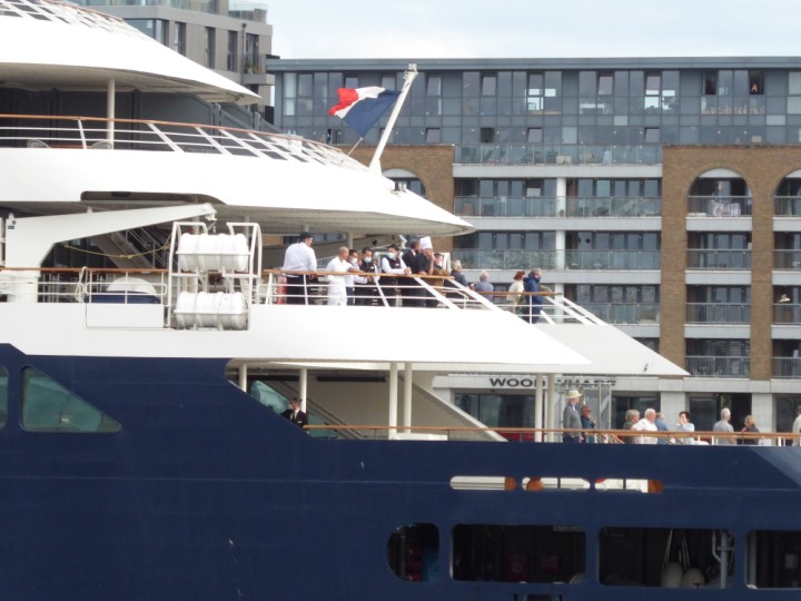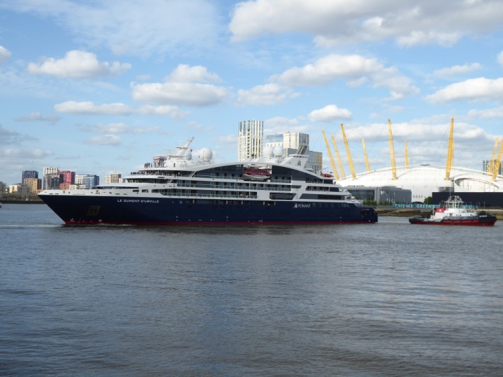 LE DUMONT D'UR VILLE *Click a Photo Above   once Big, click Right    Arrow in corner >   to start Slide Show * romagic .22 L:131x18m (431x59ft+) The Thames river Pilot and  the Tug crew guided the  Ship to Greenwich Tier, at 7pm the last ropes were attached  to secure the  Ship at its moorings. Departed next day 11th at 08.40am.  High tide. Tuesday 10th May 2022 Because the Ship departed France too Late yesterday  it missed the 9am 'High tide but the Captain still came to  the UK as scheduled, and  arrived at 'Low tide. 17:25 Not normally advised. I think most passengers are very unhappy with this cruise to London, no time for sightseeing, just a few hours last night and dark by 9:00pm.