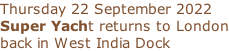West India Dock KISMET.21 REEF CHIEF .22 romagic .22m L:49.9x8.53m (161x27ft+) Thursday 22 September 2022 Super Yacht returns to London back in West India Dock Last here: 20 June 2018
